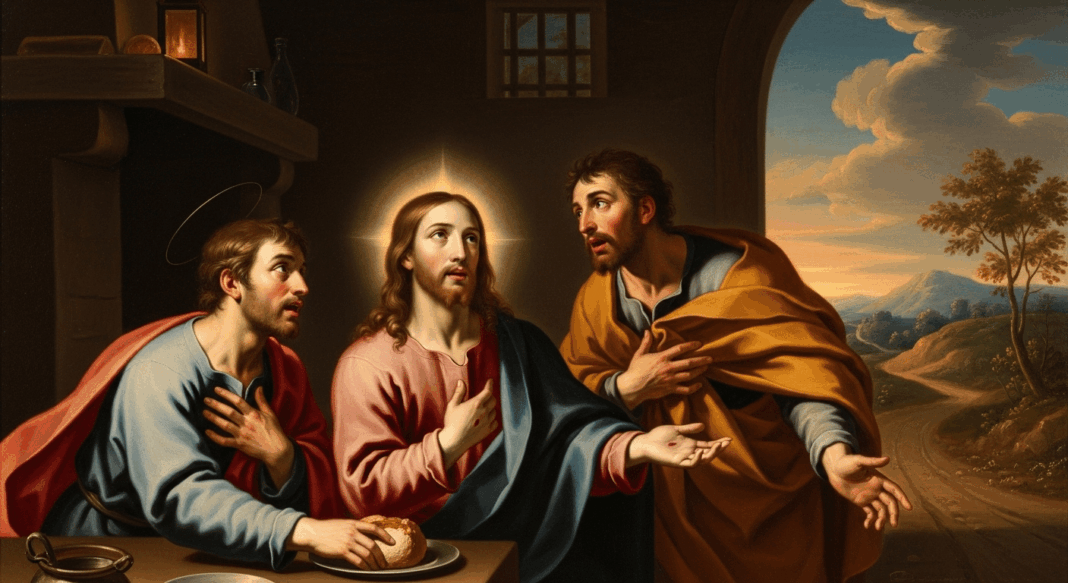 Al llegar a Emaús, le rogaron que se quedara con ellos. Y fue al partir el pan que sus ojos se abrieron y lo reconocieron. Inmediatamente, Jesús desapareció. Llenos de gozo y con el corazón ardiente, regresaron a Jerusalén para contarles a los Apóstoles lo que había sucedido.