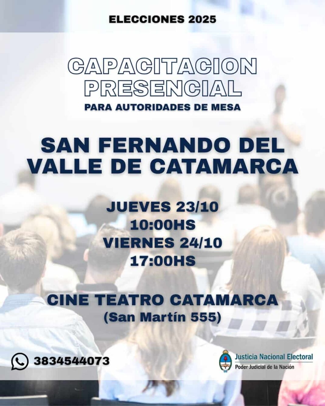 La Justicia Electoral recordó que la asistencia resulta clave para garantizar el normal desarrollo de la jornada electoral y despejar dudas operativas antes del día de la votación. Para consultas o confirmación de asistencia, se habilitó la línea 3834 544073.