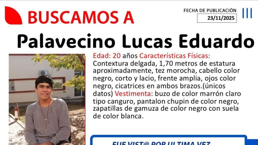 La Policía de Catamarca emitió un pedido urgente de colaboración para dar con el paradero de Lucas Eduardo Palavecino, de 20 años, quien se encuentra desaparecido desde la madrugada del sábado 22 de noviembre, cuando fue visto por última vez alrededor de la 1:30.