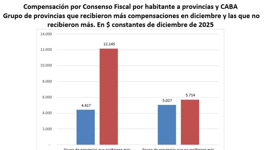 Estas 12 jurisdicciones recibieron un fuerte incremento en los envíos por Compensación por Consenso Fiscal, generando un comportamiento diferencial respecto al resto. El grupo de provincias que recibió más compensaciones en diciembre tuvo un incremento del 175% respecto al envío mensual promedio entre enero y noviembre de 2025, mientras que el otro grupo tuvo un incremento de solo el 14%», explicó Nadín Argañaraz, titular del IARAF, para contextualizar el gráfico que ilustra este artículo.