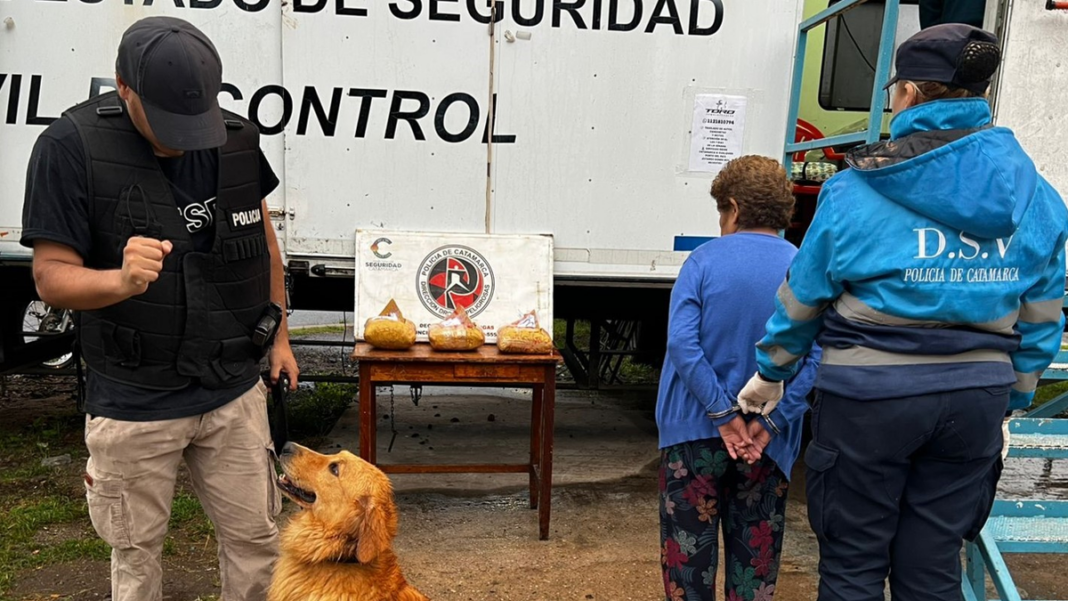 En ese momento, al inspeccionar la bodega del micro, con la ayuda del can “Apolo”, adiestrado para detectar estupefacientes, que hizo un marcaje positivo, los policías encontraron en el interior de una maleta de color negro, que pertenecería a una mujer de 76 años de edad, tres (03) piñatas que en su interior contenían paquetes envueltos con cinta de embalar transparente y marrón, con una sustancia herbácea que, al ser sometida a la prueba de campo correspondiente, arrojó como resultado que se tratarían de 3,272 Kg. de marihuana, que quedaron en calidad de secuestro.