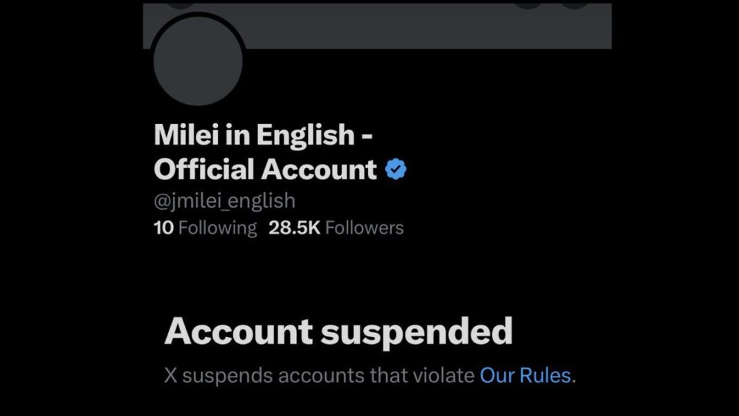 En horas de la tarde, la compañía propiedad de Elon Musk, multimillonario cercano al jefe de Estado libertario, ordenó la interrupción del usuario «jmilei_english», estrenado este mismo lunes, mediante un escueto mensaje en el que se señala: «Cuenta suspendida». Además, explican que la suspensión se debe a un incumplimiento de las reglas de la propia plataforma.