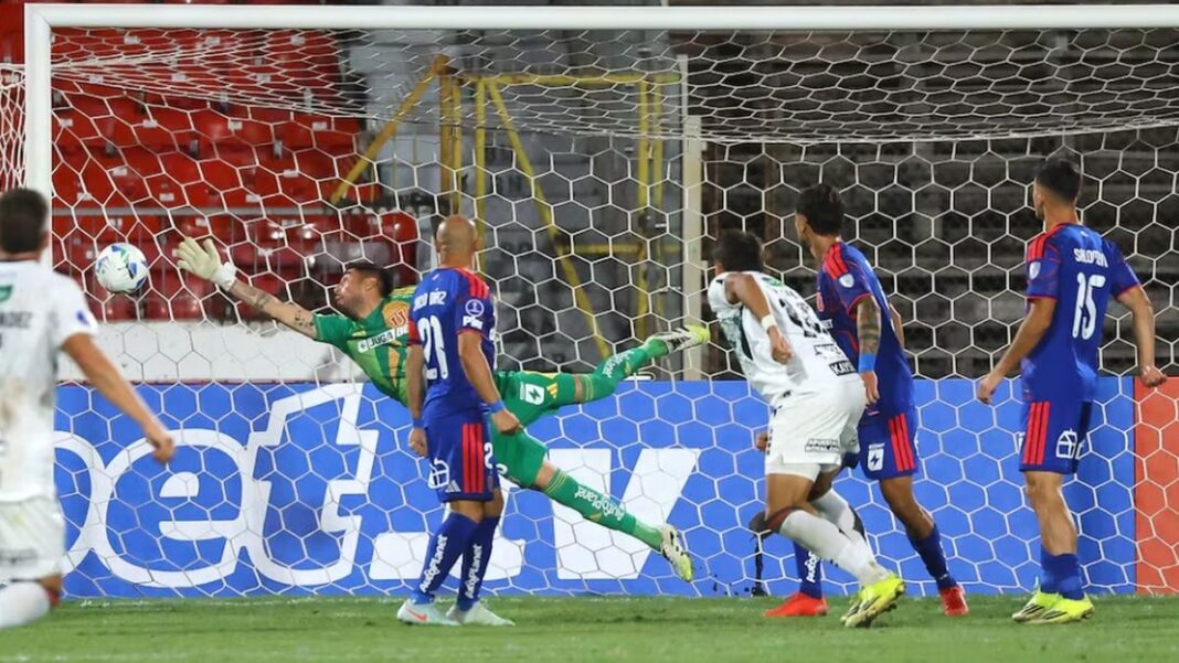 Adentro. Da Silva ya cabeceó y observa como se convierte en el primer tanto de su equipo, Palestino.